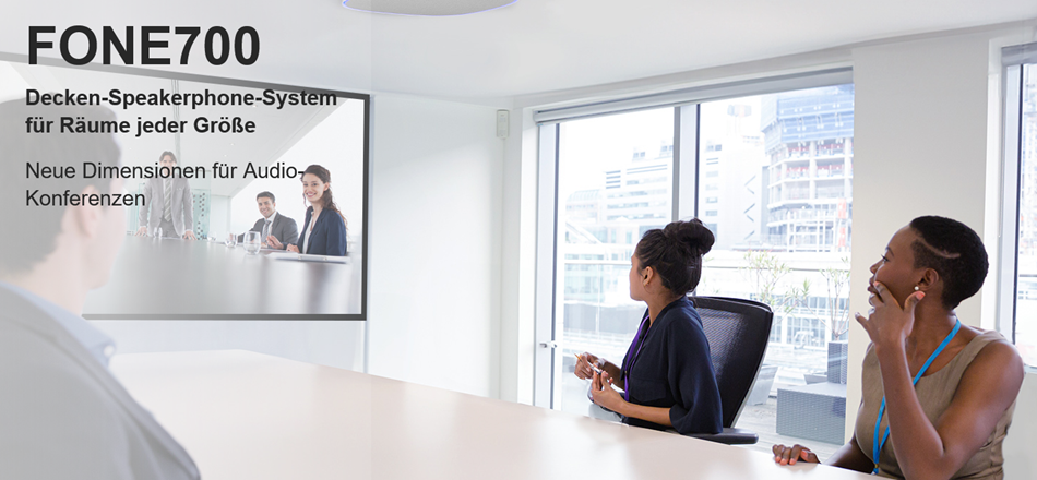 FONE700 benötigt lediglich ein einziges RJ45-Kabel für Strom und Internet. Unterstützt werden bis zu vier Speakerphones mit einer maximalen Reichweite von 40 Metern, was optimale Anpassbarkeit für Konferenzräume unterschiedlichster Größe gewährleistet.