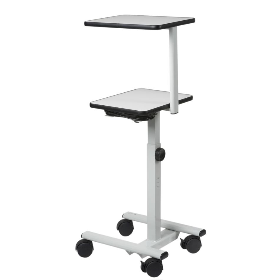 AV 2260 - Spezieller Projektortisch mit zwei Ablageflächen und druckluftbetätigtes Gegengewicht für Sicherheit und einfaches Auf- und Abbewegen. Einfache, stufenlose Höhenverstellung mit großem Fixierknopf. Zusätzliche Notebookablage Kensinton Lock-Slot 3-fach-Steckdose mit Kabelaufwickler.