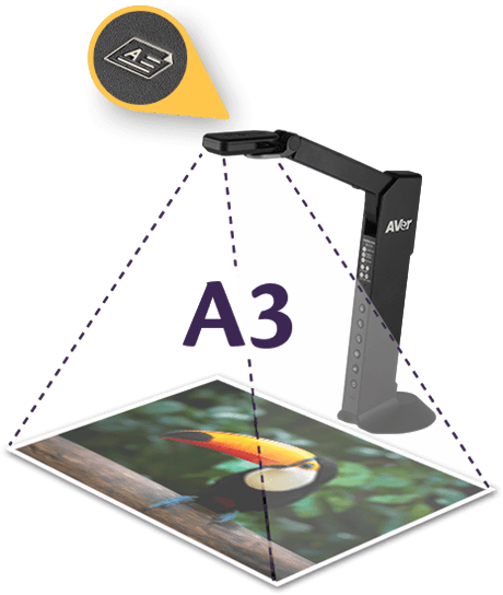 Der A3-Aufnahmebereich der M11-8MV und eine drehbare Kamera ermöglichen die freie Präsentation großer Dokumente und 3D-Modelle aus jedem Winkel - im Klassenzimmer oder online. Die durchdachte Positionsanzeige am Kamerakopf garantiert den richtigen Anzeigewinkel.