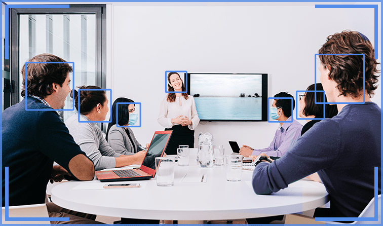 Wirksame und sichere Meetings mit aktualisiertem SmartFrame von AVer. Diese Funktion nutzt die Gesichts- und Körpererkennung der nächsten Generation, um Menschen mit Masken ebenso im Bild zu erfassen wie jedes einzelne Gesichtsprofil in einer Entfernung von 7 bis 10 Meter.