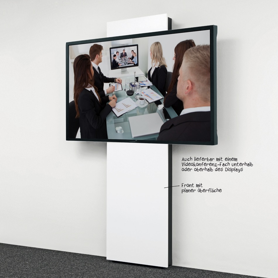Elegantes Vorwandsystem zur Installation eines Monitors oder interaktiven Displays und weiteren medientechnischen Elementen, verborgen hinter einem abnehmbarem Frontpaneel.
