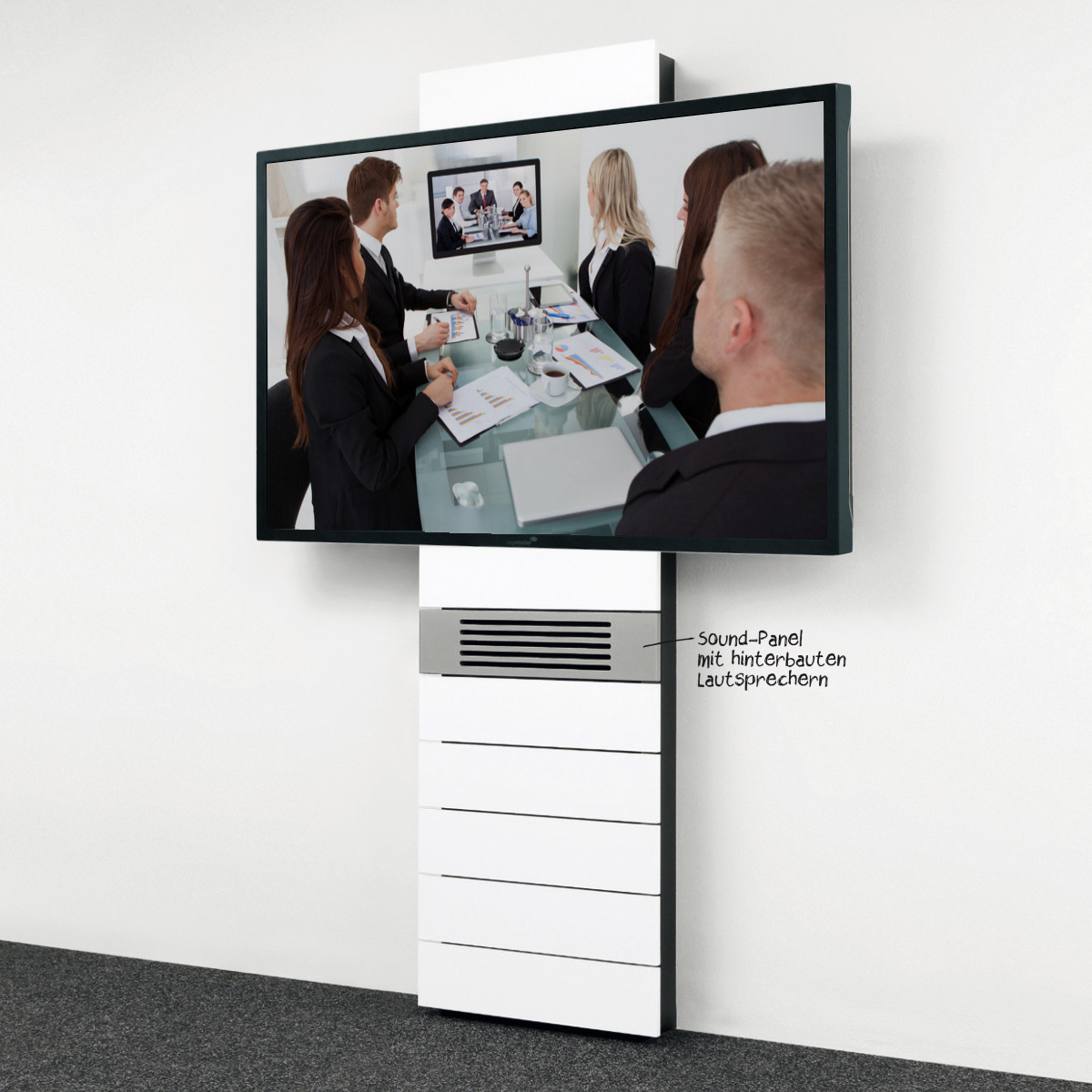 Elegantes Vorwandsystem zur Installation eines Monitors oder interaktiven Displays und weiteren medientechnischen Elementen, verborgen hinter einem abnehmbarem Frontpaneel. Lautsprecher können hinter einer geschlitzten Blende (lackiert in RAL nach Wahl) montiert werden.