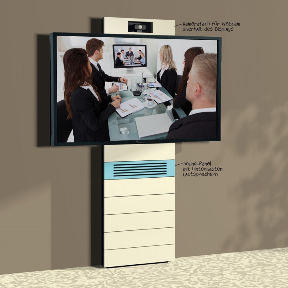 Elegantes Vorwandsystem zur Installation eines Monitors oder interaktiven Displays und weiteren medientechnischen Elementen, verborgen hinter einem abnehmbarem Frontpaneel. Oberhalb des Displays befindet sich ein Kamerafach für Webcams. Lautsprecher können hinter einer geschlitzten Blende (lackiert in RAL nach Wahl) montiert werden.