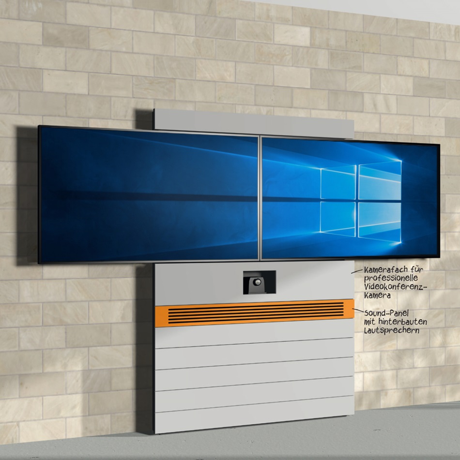Elegantes Vorwandsystem zur Installation zweier Monitore oder interaktiven Displays und weiteren medientechnischen Elementen, verborgen hinter einem abnehmbarem Frontpaneel. Unterhalb der Displays befindet sich ein Kamerafach für Webcams. Lautsprecher können hinter einer geschlitzten Blende (lackiert in RAL nach Wahl) montiert werden.