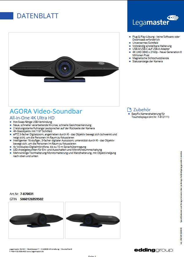 Die JPL Agora ist eine All-in-One 4K Ultra HD Video Sound Bar, perfekt für große Konferenzräume. Sie ist mit einem KI-gesteuerten intelligenten Zoom, vier Stereo-Duplex-Mikrofonen mit einer Reichweite von 10 Metern und zwei Allround-Lautsprechern ausgestattet. Die Agora verfügt außerdem über eine Bluetooth-Fernbedienung und eine magnetische Sichtschutzabdeckung, die sicherstellt, dass das Objektiv geschützt ist.