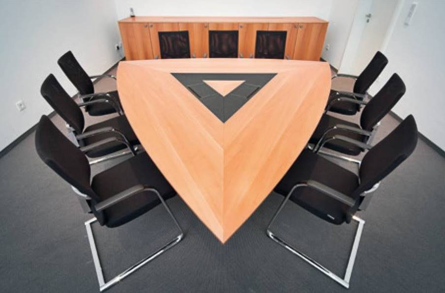 Mit seiner außergewöhnlichen Form ermöglicht dieser Tisch eine annähernd demokratische Sitzordnung. Zudem bietet der Wankeltisch in Besprechungsrunden optimale Sichtverhältnisse zur Videokonferenz. Mit den entsprechenden Medieneinbauten werden so funktionierende Einheiten gebildet.