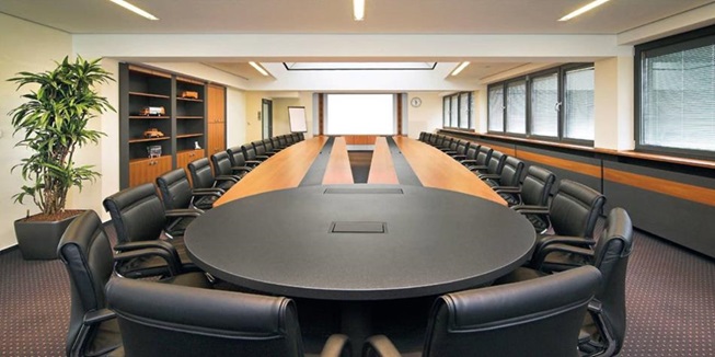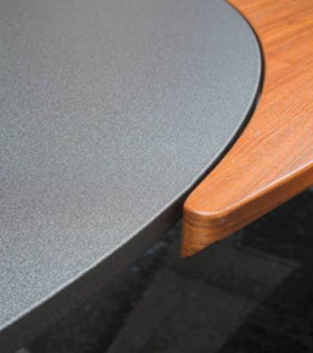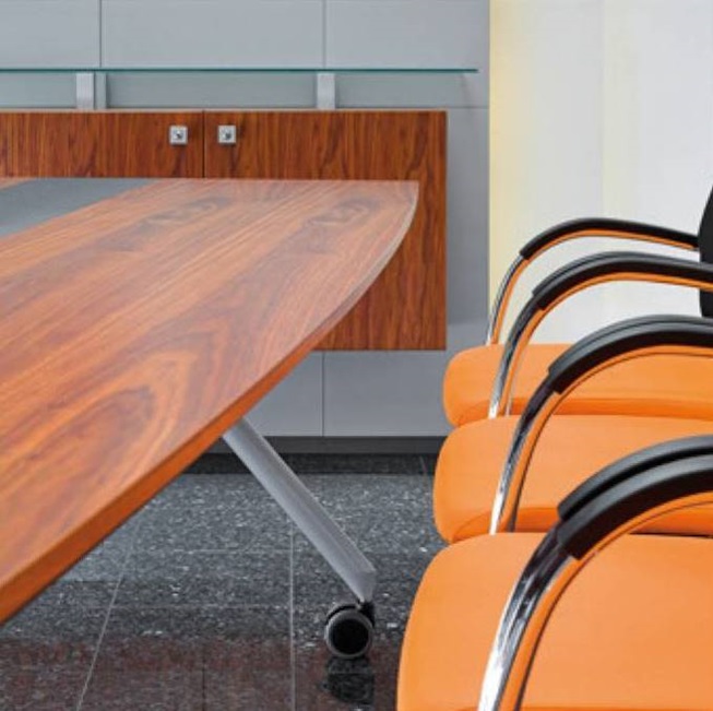 Hochwertige Platte (ca. 39 mm) mit Konferenzkante (45°-Schräge, farbig abgesetzt), mit oder ohne Akzent-Einleger, mit passendem Sonderfußgestell: Säulenfuß am Rondell, rollbares Untergestell an den Zangen