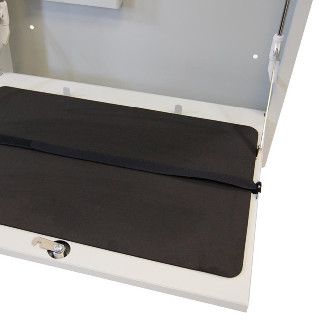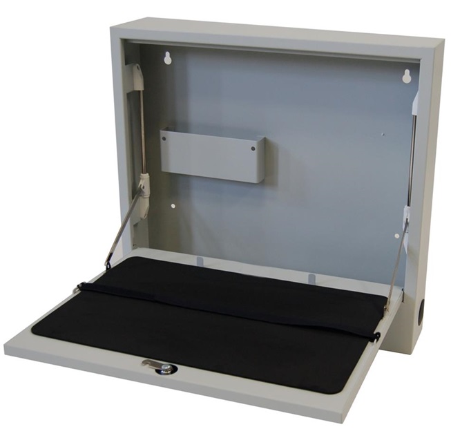 Laptop Safe Deluxe - zur Wandmontage geeignet - Aufnahme von Laptops bis 19" Größe aus robustem Stahlblech, pulverbeschichtet Abmessung (H x B x T in mm) 540 x 570 x 105 ausgestattet mit: - Soft-Dämpfung der Frontklappe - Antirutsch Notebookunterlage - 1 kleines Ablagefach - Kabeldurchführungen - Kabelmanagement - Robustes Schloss.