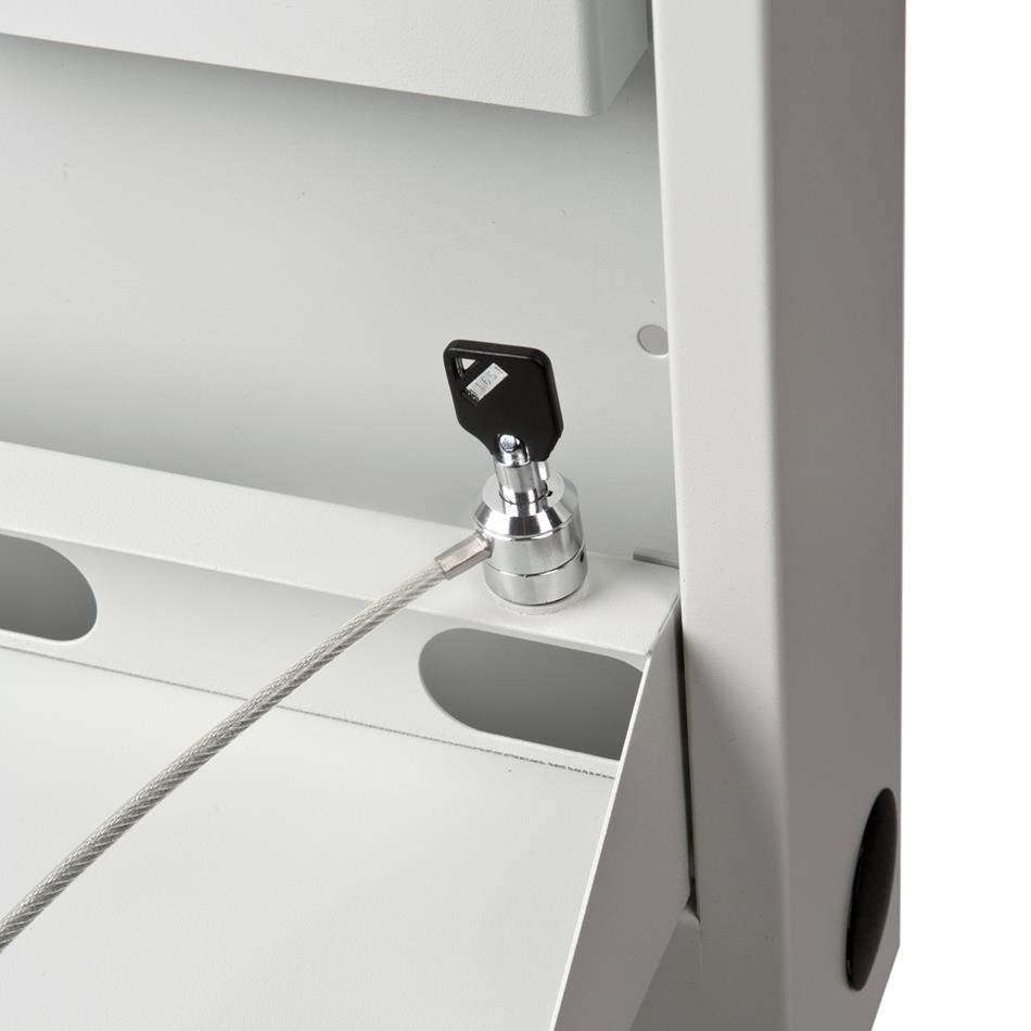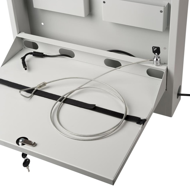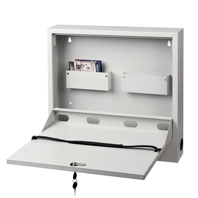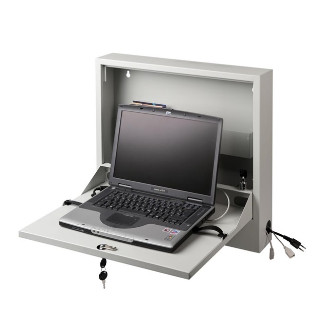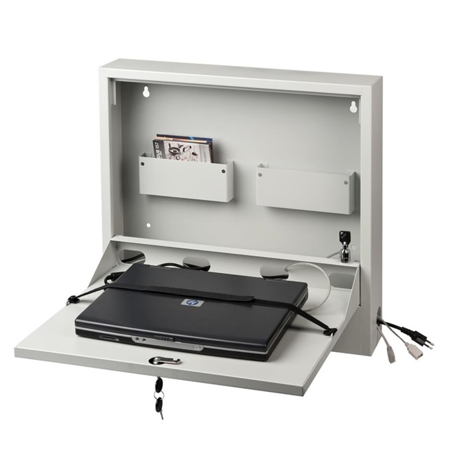 Laptop Safe - zur Wandmontage geeignet - Aufnahme von Laptops bis 19" Größe aus robustem Stahlblech, pulverbeschichtet Abmessung (H x B x T in mm) 540 x 570 x 105 ausgestattet mit: - 2 kleinen Ablagefächern - Kabeldurchführungen - Kabelmanagement - Robustes Schloss