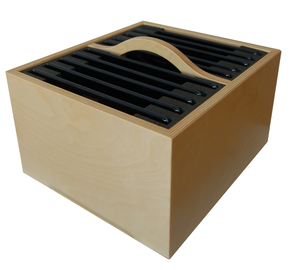 portables Transportbehätlnis für bis zu 10 Tablets (max. 10" /Diagonal 254mm) aus buchefarbenem Holz und farblos lackiert Aufnahmetiefe / pro Tablet: 22mm, daher gut zur Aufnahme eines Tablet mit Schutzhülle geeignet Gewicht: 2,4kg