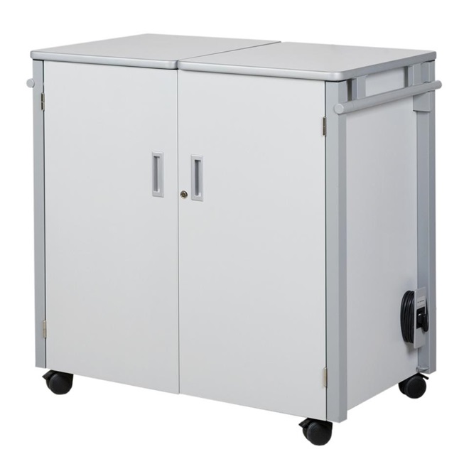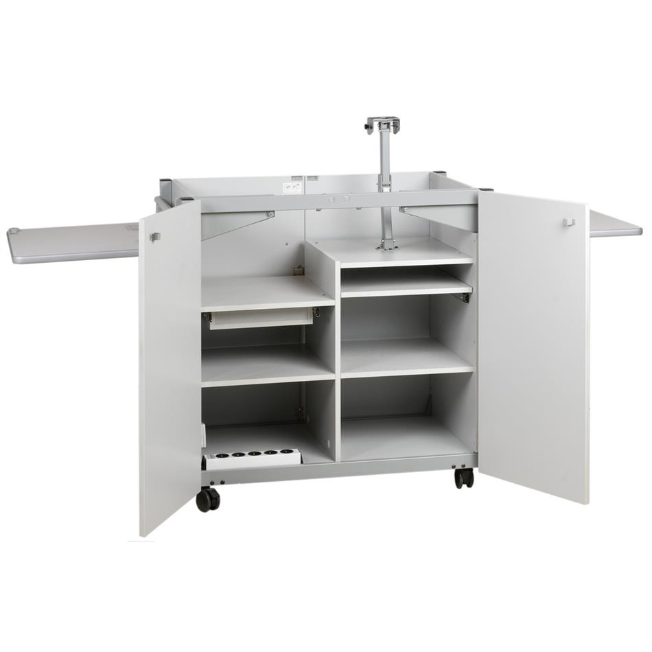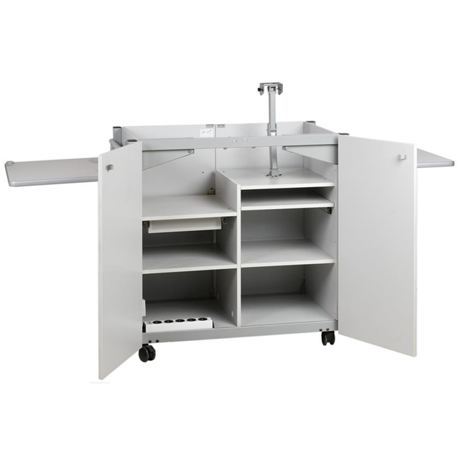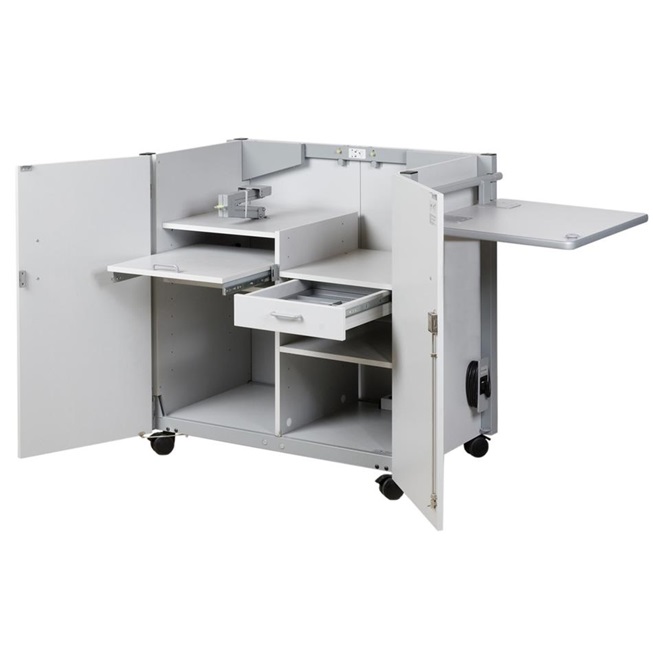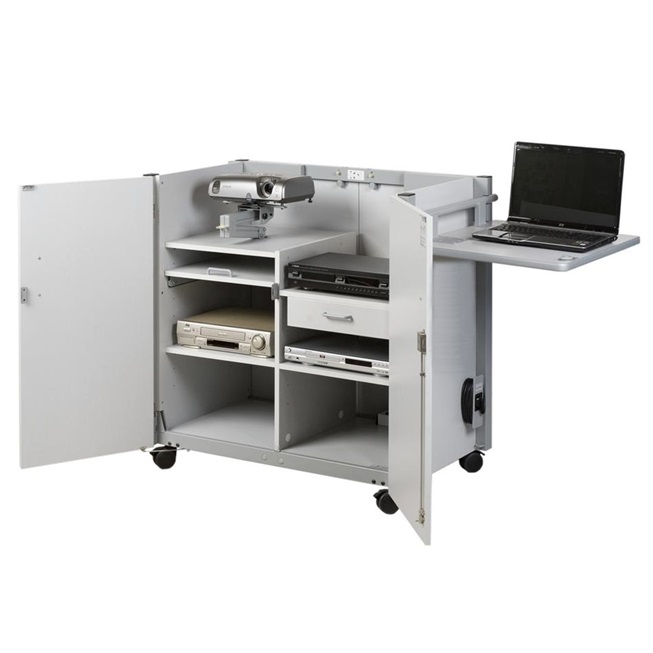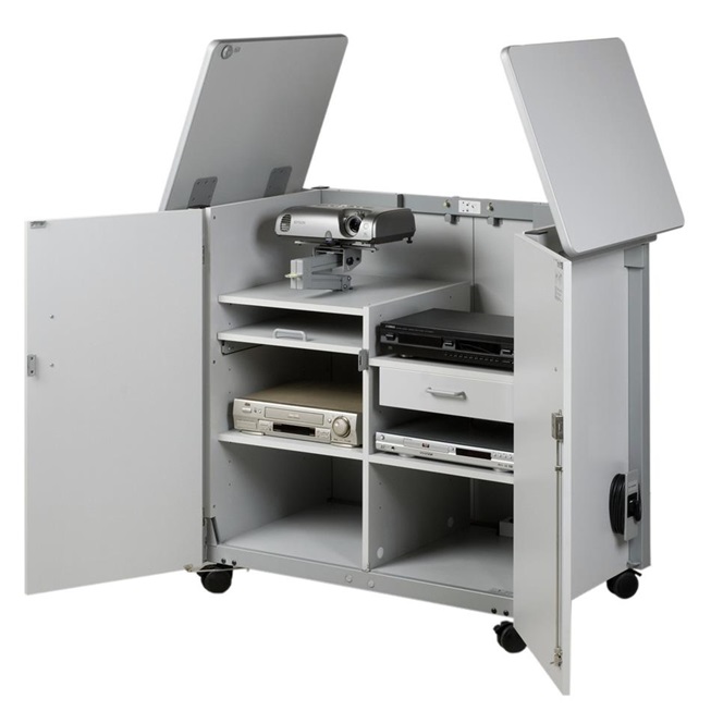 Der Medienschrank Komfort ist ein mobiler, abschließbarer Medienschrank, der für die praktische Verwendung eines Beamers und eines OHP´s im Klassenraum entwickelt wurde. Er verfügt über eine Fünffachsteckdose, 5m Stromkabel, mehrere Ablagefächer und eine Schublade. Die obere Abstellfläche kann in zwei Teilen geöffnet werden (Gasdruckfedermechianismus bietet hohen Komfort) und kann als zusätzlich Stellfläche dienen.