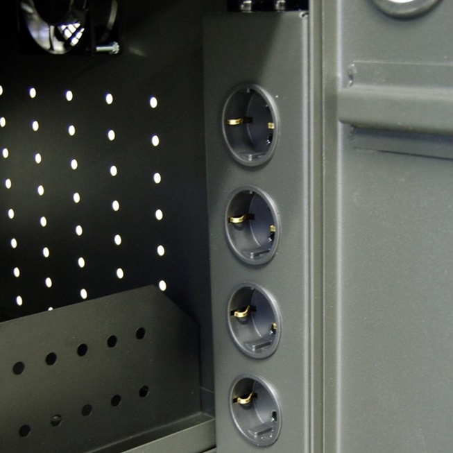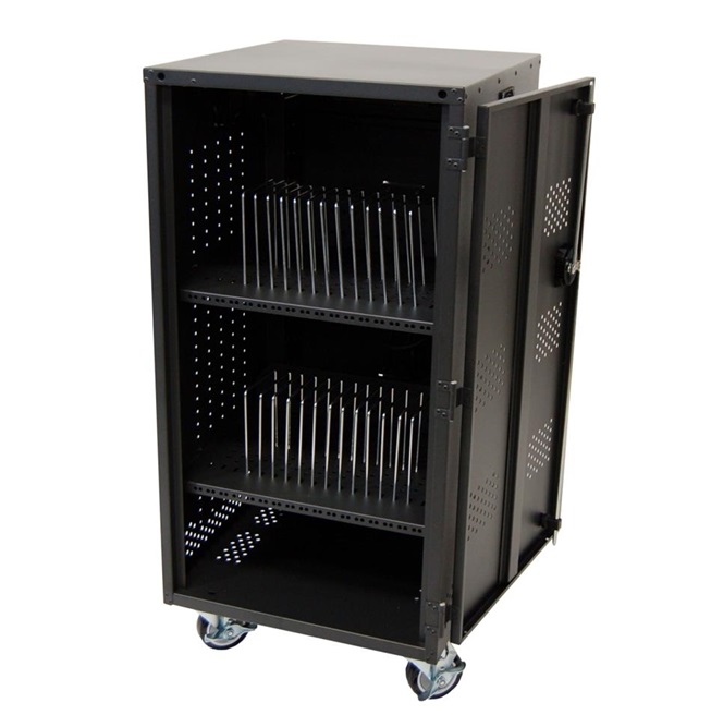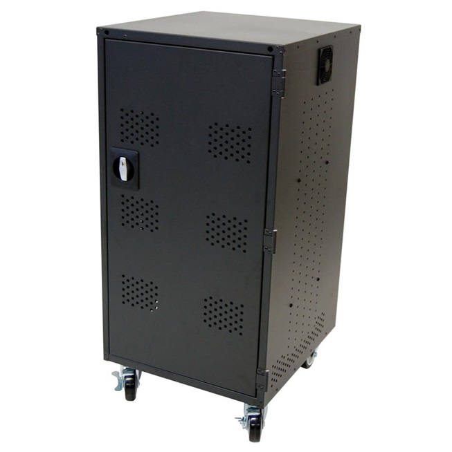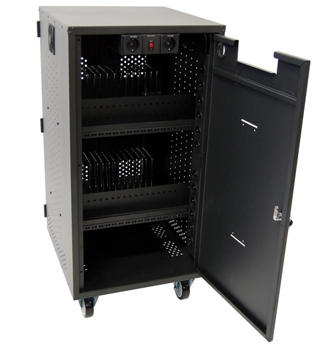 zur sicheren Unterbringung sowie Aufladung von 24 Tablet PCs oder bis zu 16 Notebooks (max. Größe 15,6") robuste Metallkonstruktion, abschließbar und diebstahlsicher