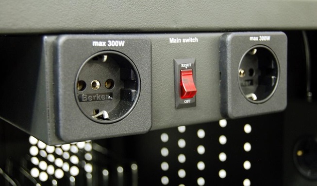 mit 2 außenliegenden, zusätzlichen Steckdosen (f. z.B. Einsatz einer Dokumentenkamera oder auch Beamer)
