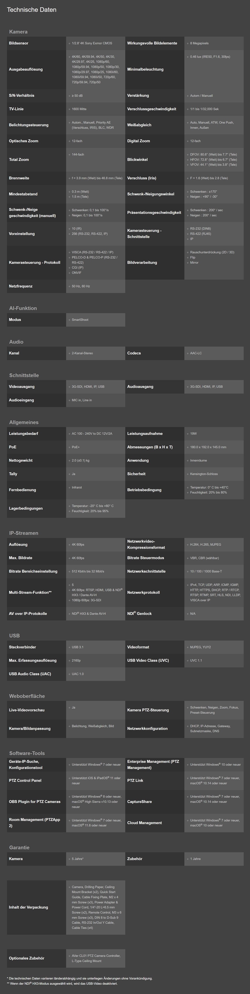 Die AVer PTZ310UV2 ist eine hochmoderne PTZ-Kamera mit 4K 60 fps HDMI-, USB- und IP-Ausgängen. Das 12-fach optische Zoomobjektiv bewegt sich bemerkenswert flüssig, um nahtlose Videoinhalte zu streamen. Die eingebetteten intelligenten Funktionen SmartShoot bietet einzigartige Flexibilität bei allen Aufnahmen, von einem Moderator bis zu unzähligen Teilnehmenden, für eine wirklich vielseitige und professionelle Streaming-Lösung.