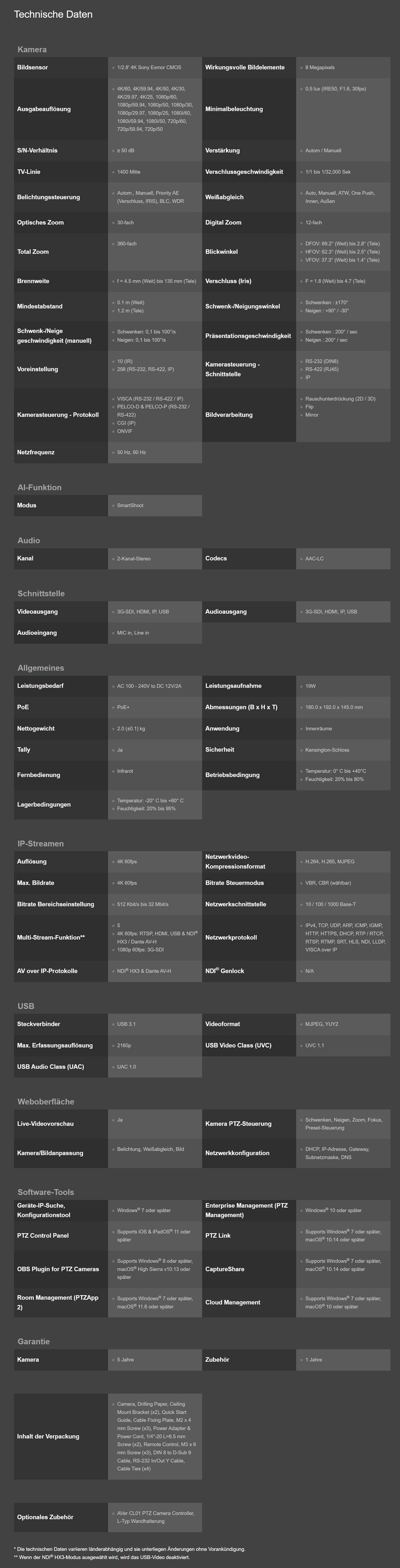 Die AVer PTZ330UV2 ist eine hochmoderne PTZ-Kamera mit 4K 60 fps HDMI-, USB- und IP-Ausgängen. Das 30-fach optische Zoomobjektiv bewegt sich bemerkenswert flüssig, um nahtlose Videoinhalte zu streamen. Die eingebetteten intelligenten Funktionen SmartShoot bietet einzigartige Flexibilität bei allen Aufnahmen, von einem Moderator bis zu unzähligen Teilnehmenden, für eine wirklich vielseitige und professionelle Streaming-Lösung.