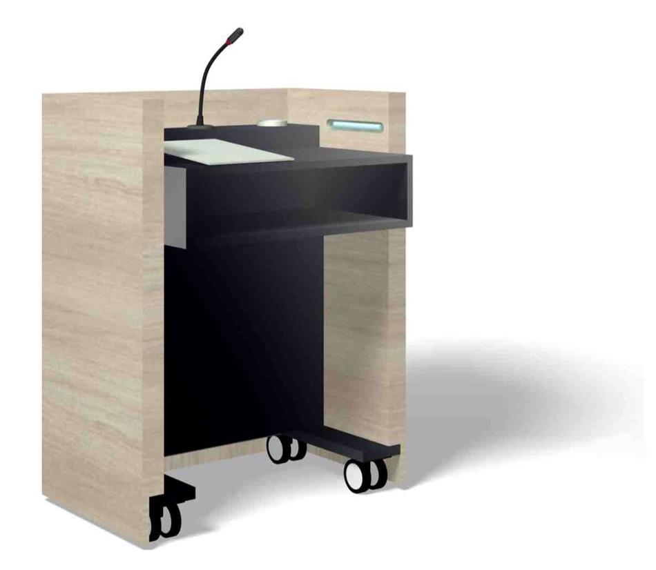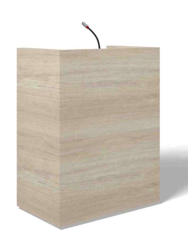 Im Inneren bietet es in der Grundversion eine schräge Dokumentenfläche, eine Ablage für ein Notebook, Beleuchtung, Wasserglasring, eine digitale Redezeituhr und ein Anschlußfeld für Medientechnik.