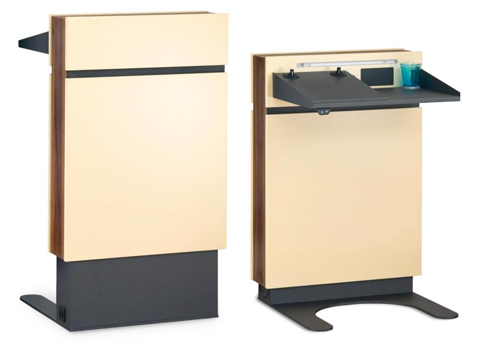 Reduziert auf das Wesentliche beinhaltet das Rednerpult die notwendigen Funktionen: Stellflächen und technische Elemente lassen keine Wünsche offen. Der Designfuß trägt geschickt den höhenverstellbaren Korpus, der durch seine Schlichtheit überzeugt – die äußere Erscheinung ist individuell wählbar.