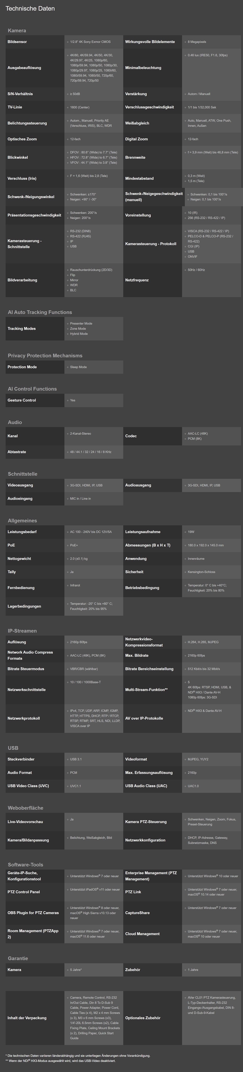 AVers neue TR315 KI Auto Tracking PTZ-Kamera erweitert die leistungsstarken und zuverlässigen Pro AV-Fähigkeiten für Anwender in der gesamten Industrie. Die TR315 beeindruckt mit proprietären Funktionen — einschließlich Tracking im Presenter-Modus, Zonenmodus und Hybridmodus — gestützt auf fortschrittliche KI-Verarbeitung. Die nahtlose Zusammenführung von 12-fach optischer Zoomlinse, 4K 60 fps Auflösung, Feinheit von Hybrid-Auto-Tracking und reibungslosen PTZ-Abläufen ist schon heute die erste Wahl für Senden, Streamen und Aufzeichnen.